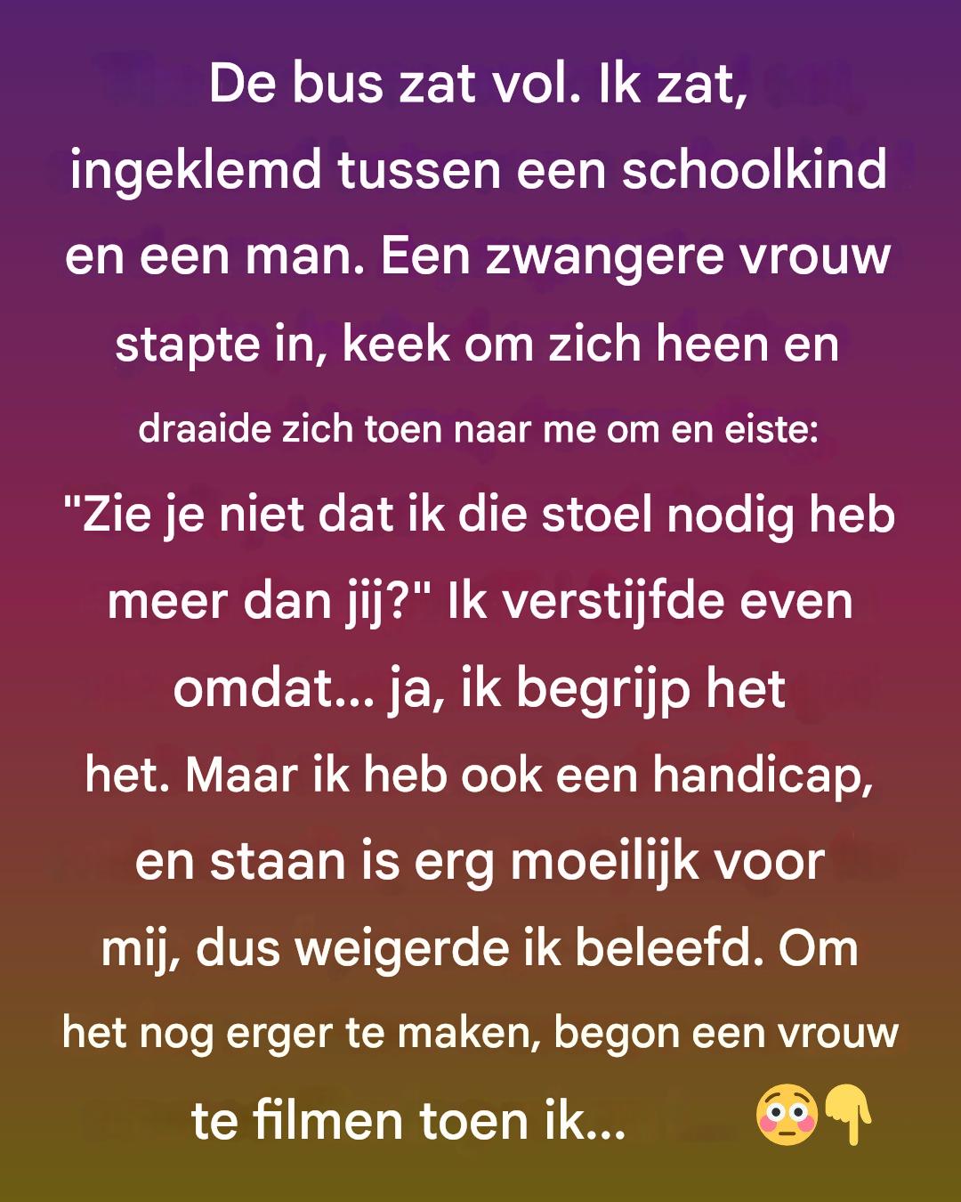 Ik verstijfde even, want… ja, ik snap het. Maar ik heb ook een beperking, en staan is echt moeilijk voor me, dus ik weigerde beleefd. Ze staarde me alleen maar aan en maakte opmerkingen alsof ik loog.
