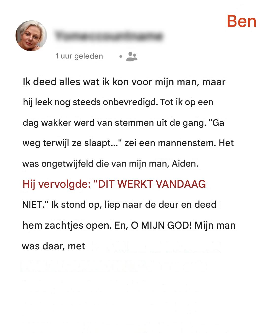 Ik deed alles wat ik kon voor mijn man, maar hij leek nog steeds onbevredigd. Op een dag werd ik wakker en hoorde ik de stem van mijn man in de gang, vergezeld door een vrouwenstem. « Hoe kon hij dat nou? », dacht ik. En dat was de druppel.