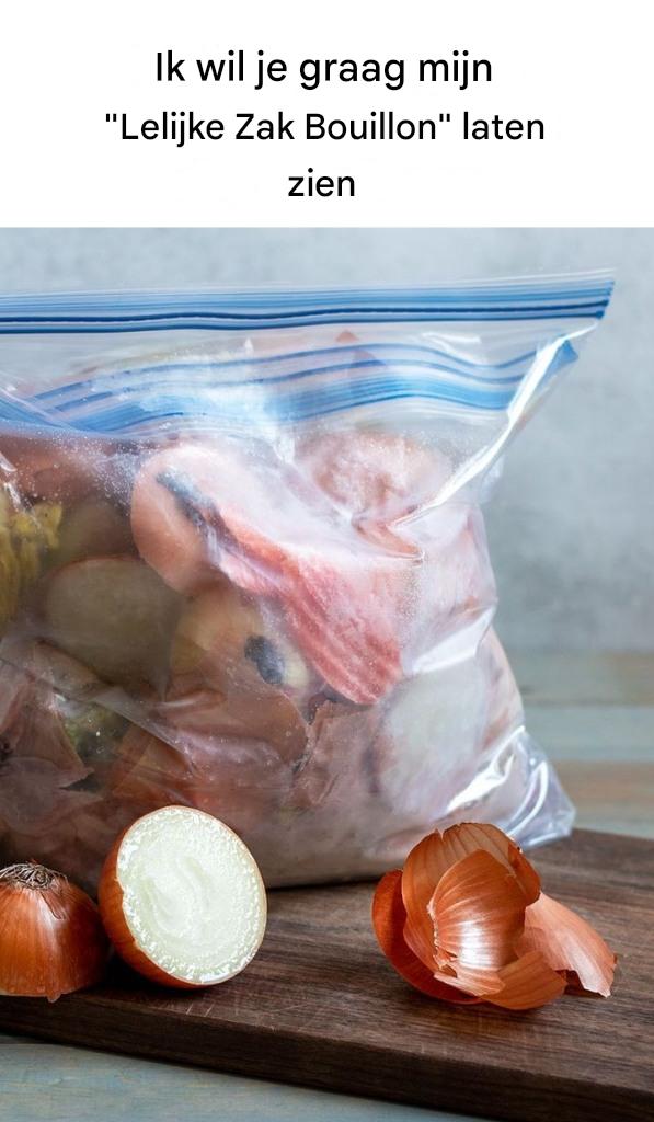 Champignonstelen Gesmoorde bieslookblaadjes Tomatenloofjes die ik eraf heb gesneden Botten van de kippendijen die we vorige week aten Korst van een blok Parmezaanse kaas die ik vorige maand heb afgemaakt