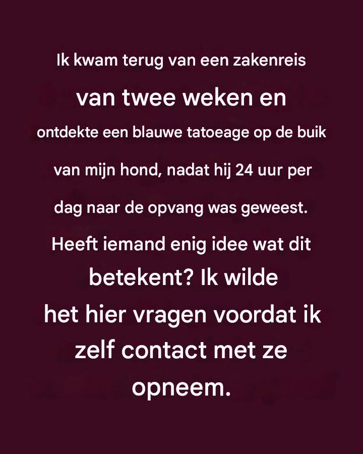 Toen u thuiskwam van een zakenreis van twee weken, keek u ernaar uit om uw geliefde hond te zien, die 24 uur per dag in een kinderdagverblijf verbleef. Bij nadere inspectie zag u echter iets ongewoons: een blauwe tatoeage op haar buik. Deze onverwachte ontdekking verbaasde u en maakte u zich zorgen over de betekenis ervan. Voordat u conclusies trekt, is het belangrijk om informatie te verzamelen en de mogelijke redenen voor deze tatoeage te begrijpen.