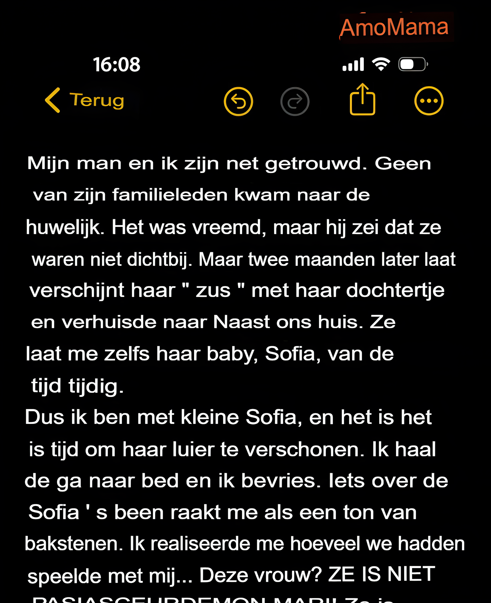 Maar toen ik naar zijn luiers keek, zag ik dat ze nog steeds kraakhelder waren. Ik was nog bezig de luier om Sofia’s middel te doen toen ik de moedervlek op haar rug zag. Een paar seconden lang bleef ik stokstijf staan, mijn ogen gericht op deze moedervlek die mij zo bekend voorkwam. Ik zou zweren dat het ook op de rug van mijn man zat.