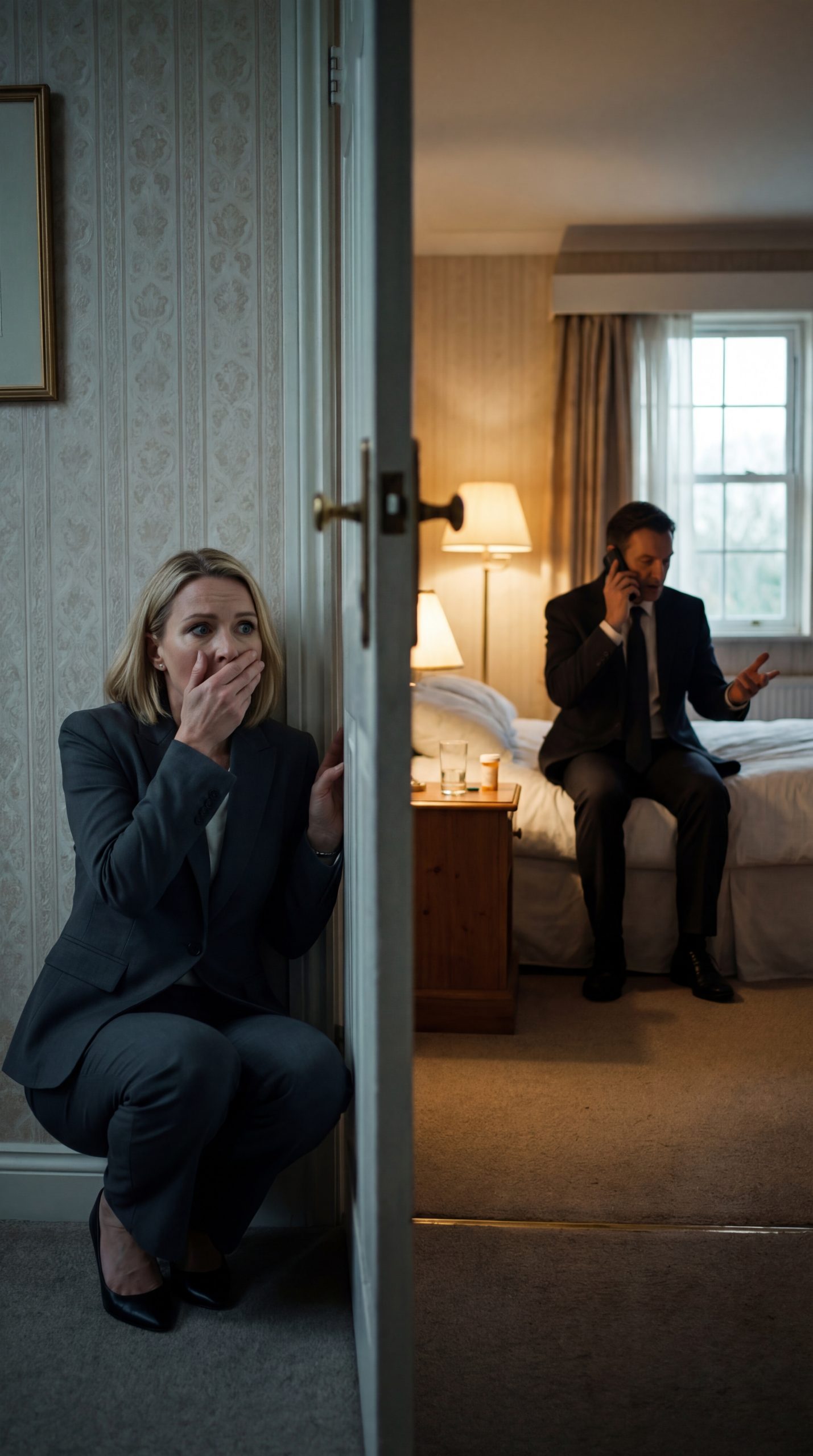 Mijn hartslag bonkte zo hard dat ik mijn handpalm tegen de muur moest drukken om mezelf in bedwang te houden, want op dat moment liep de man die die ochtend nog onder de dekens had liggen hoesten, met de zelfverzekerde houding van iemand die helemaal niet ziek was geweest, heen en weer over het vloerkleed in de woonkamer.