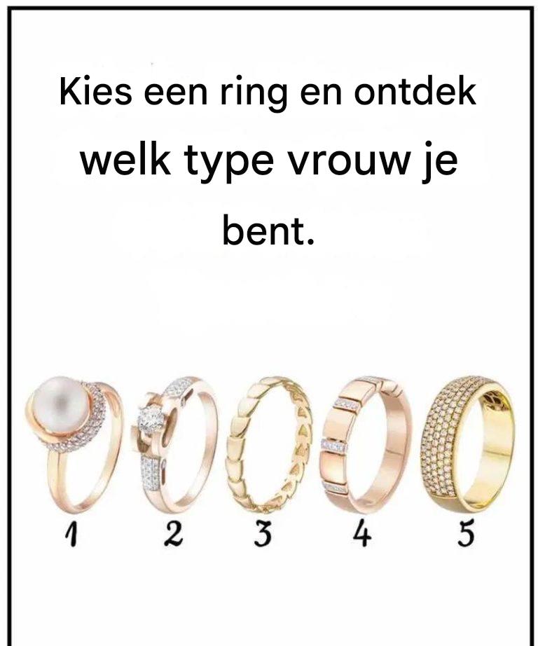 Bekijk de vijf ringen op de afbeelding hierboven en kies degene die je meteen aanspreekt. Denk niet te lang na en kies degene die het beste bij je past. Als je je keuze hebt gemaakt, lees dan de onderstaande beschrijving om te ontdekken wat je keuze zegt over wat voor soort vrouw je bent.