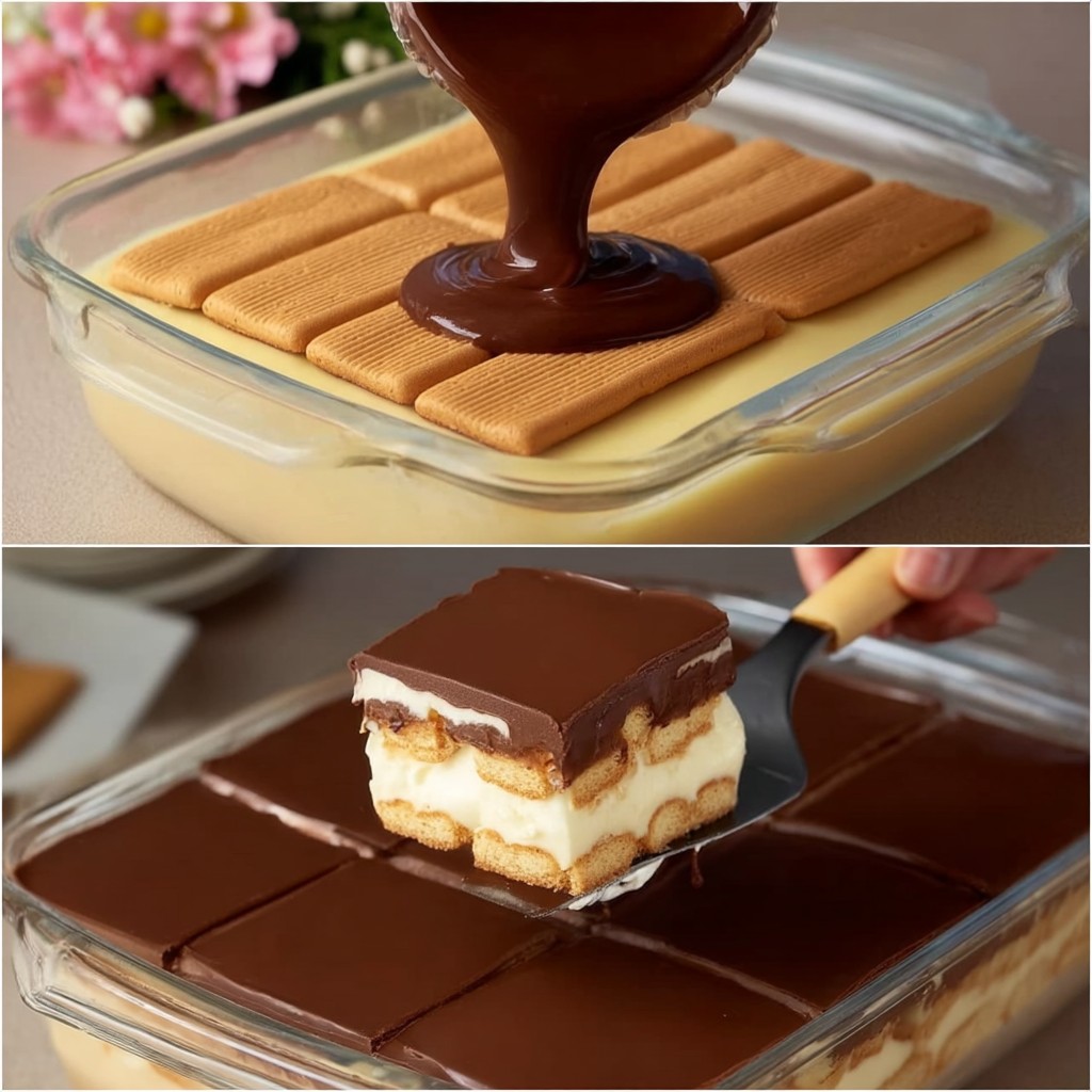 Koude cake met Mariakoekjes – een klassieker van oma Ingrediënten: – 300 g Mariakoekjes – 500 ml melk – 2 eetlepels cacao (optioneel – om de koekjes in te weken) – 200 g boter (zacht) – 100 g poedersuiker – 1 theelepel vanille-extract – 1 vanillepudding (40 g) + 400 ml melk – 100 ml 30% room – 1 eetlepel suiker (voor de room) – geraspte chocolade of cacao voor decoratie Bereidingswijze:![]()