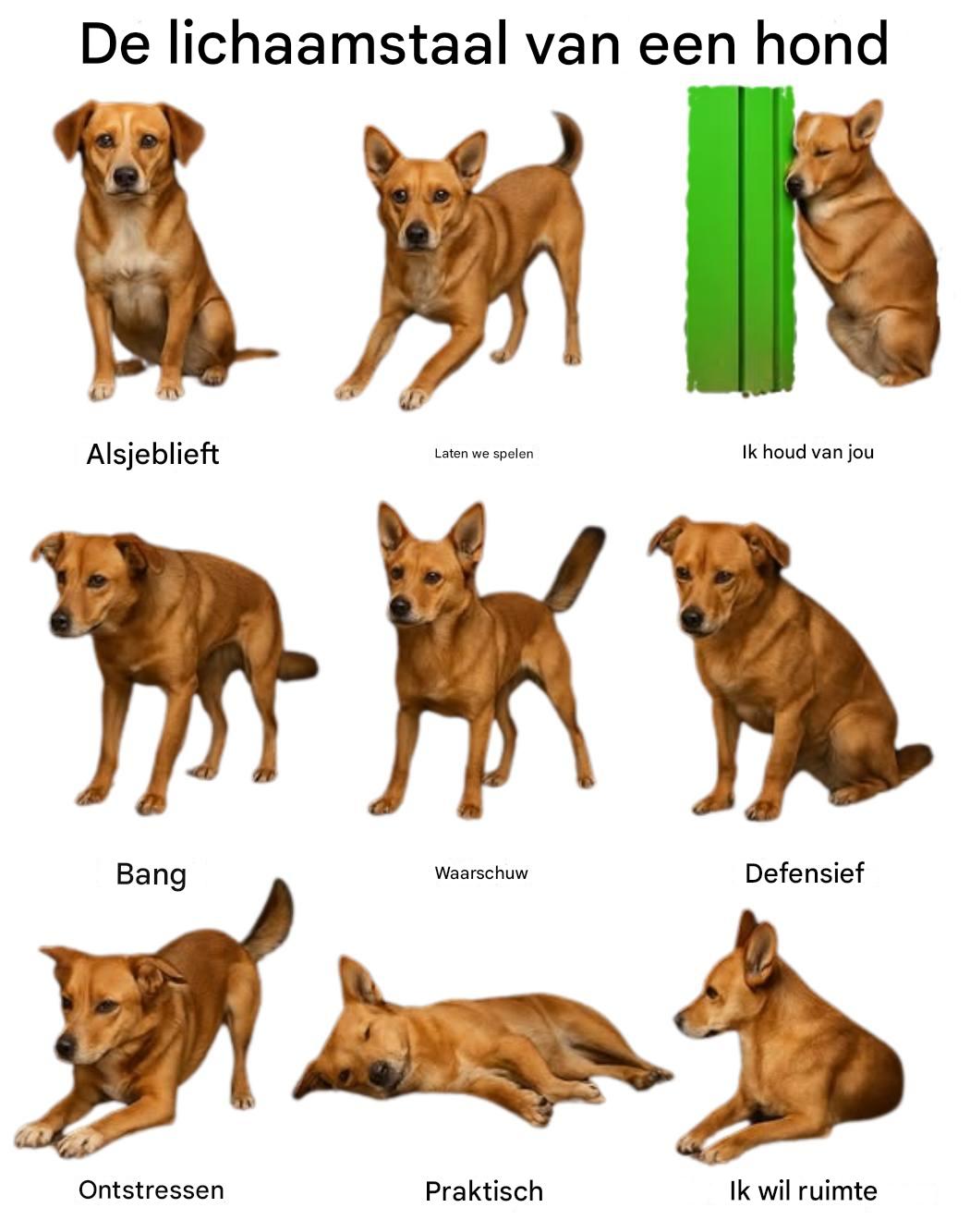 • Defensief: lichaam stijf, hoofd en staart laag = angst of bedreiging