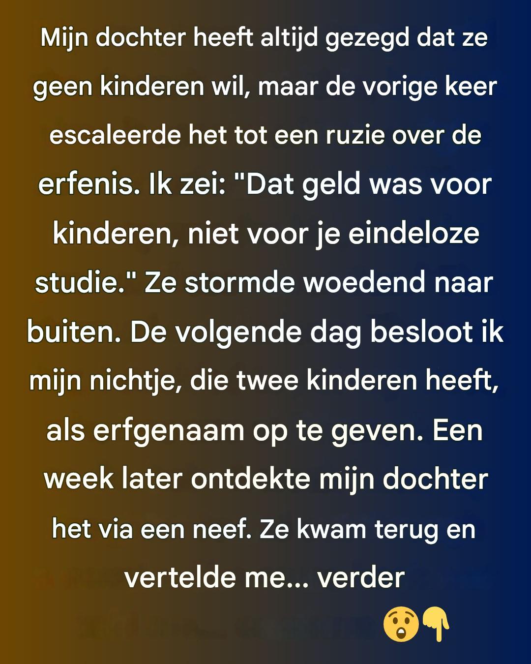 De volgende dag, nog steeds van streek, nam ik een beslissing die ik destijds praktisch vond: ik herschreef mijn testament. In plaats van alles aan mijn dochter na te laten, stelde ik mijn nichtje als erfgenaam aan. Ze heeft twee kinderen, en ik overtuigde mezelf ervan dat het geld op die manier tenminste zou dienen voor het doel dat ik me altijd had voorgesteld: een gezin onderhouden en stichten.