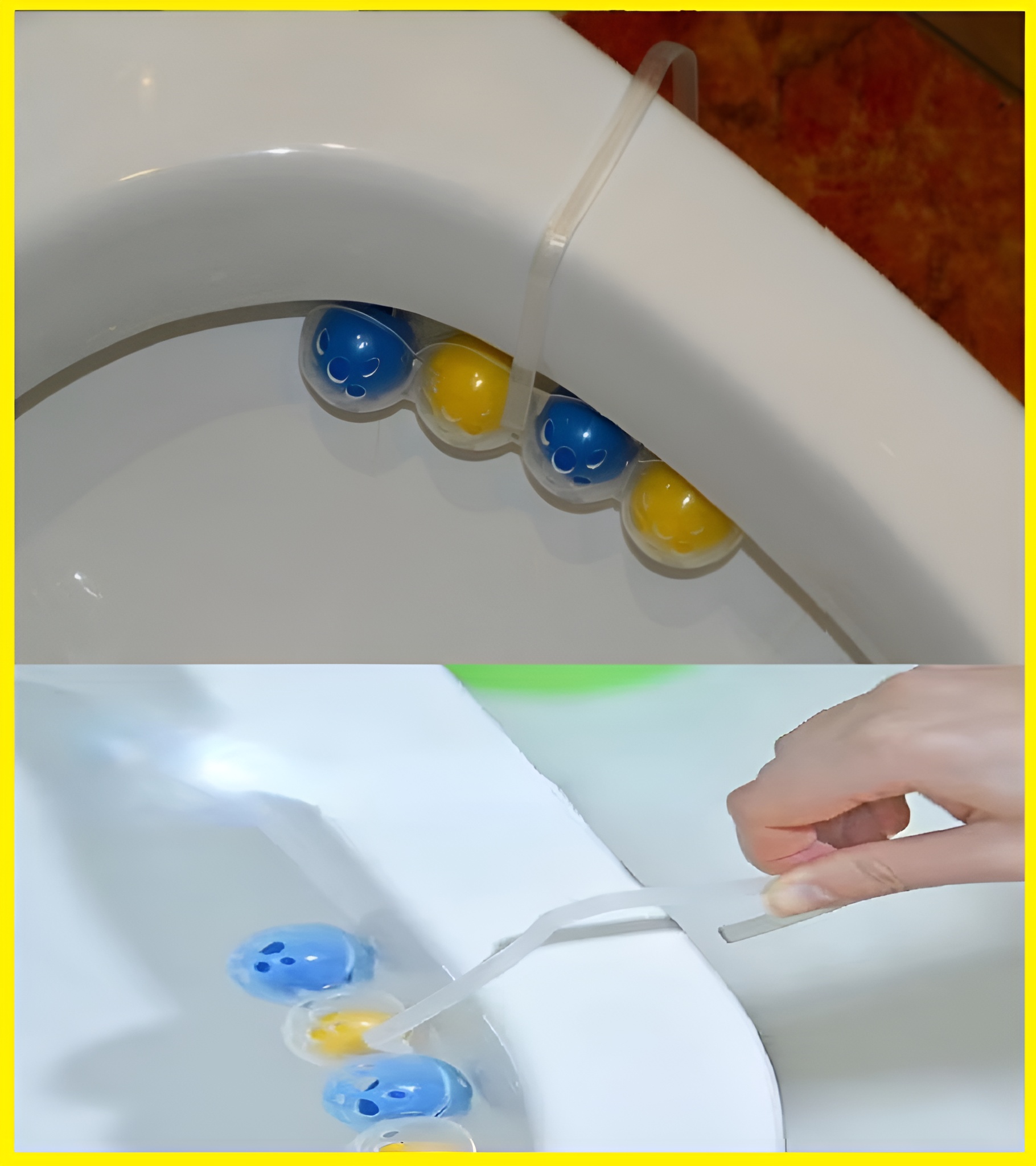 Neem het toiletblok: Kies een toiletblok dat je normaal gebruikt, met clips om aan de toiletpot te hangen.