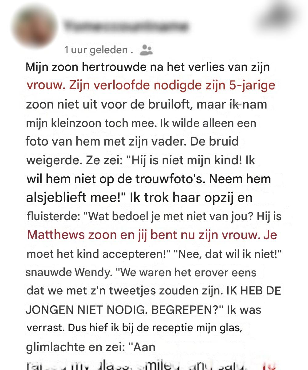 Wendy maakte duidelijk dat mijn kleinzoon niet welkom was, niet op haar bruiloft, niet in haar huis en niet in haar leven. Mijn zoon was erbij, maar ik niet. Ik bleef glimlachen, speelde de toegewijde schoonmoeder en wachtte op het juiste moment om iedereen te laten zien met wat voor vrouw hij getrouwd was.
