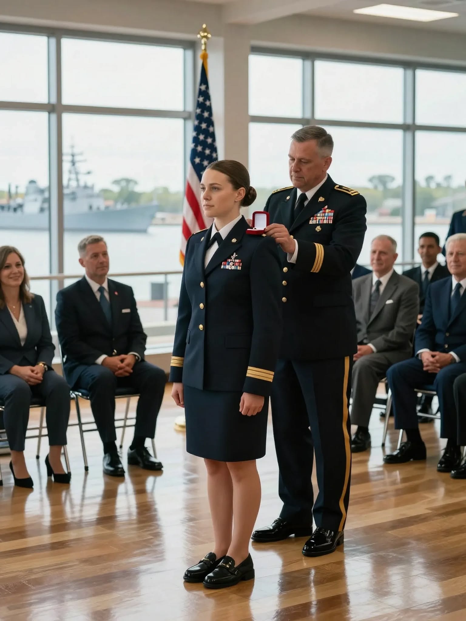 De aula leek wel een tunnel toen ik naar het podium liep. Admiraal Harris speldde de Purple Heart met vaste hand op mijn borst – professioneel, nauwkeurig, bijna teder.