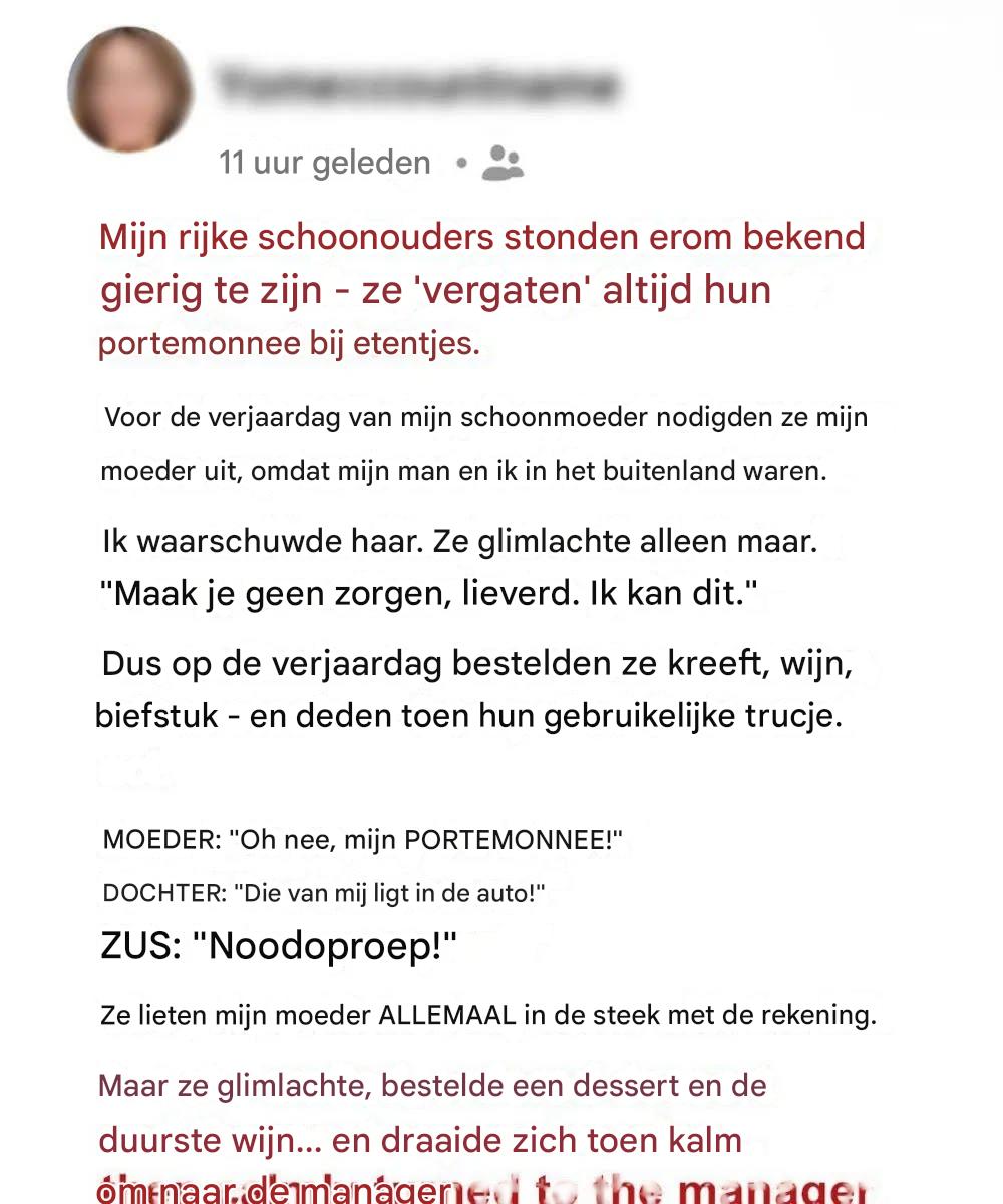 De rijke ouders van mijn man hadden de bekende gewoonte om hun portemonnee te ‘vergeten’ wanneer ze uit eten gingen – een handige misser waardoor anderen voor hun luxe maaltijden moesten betalen. Ik had het vaker meegemaakt dan ik kon tellen.