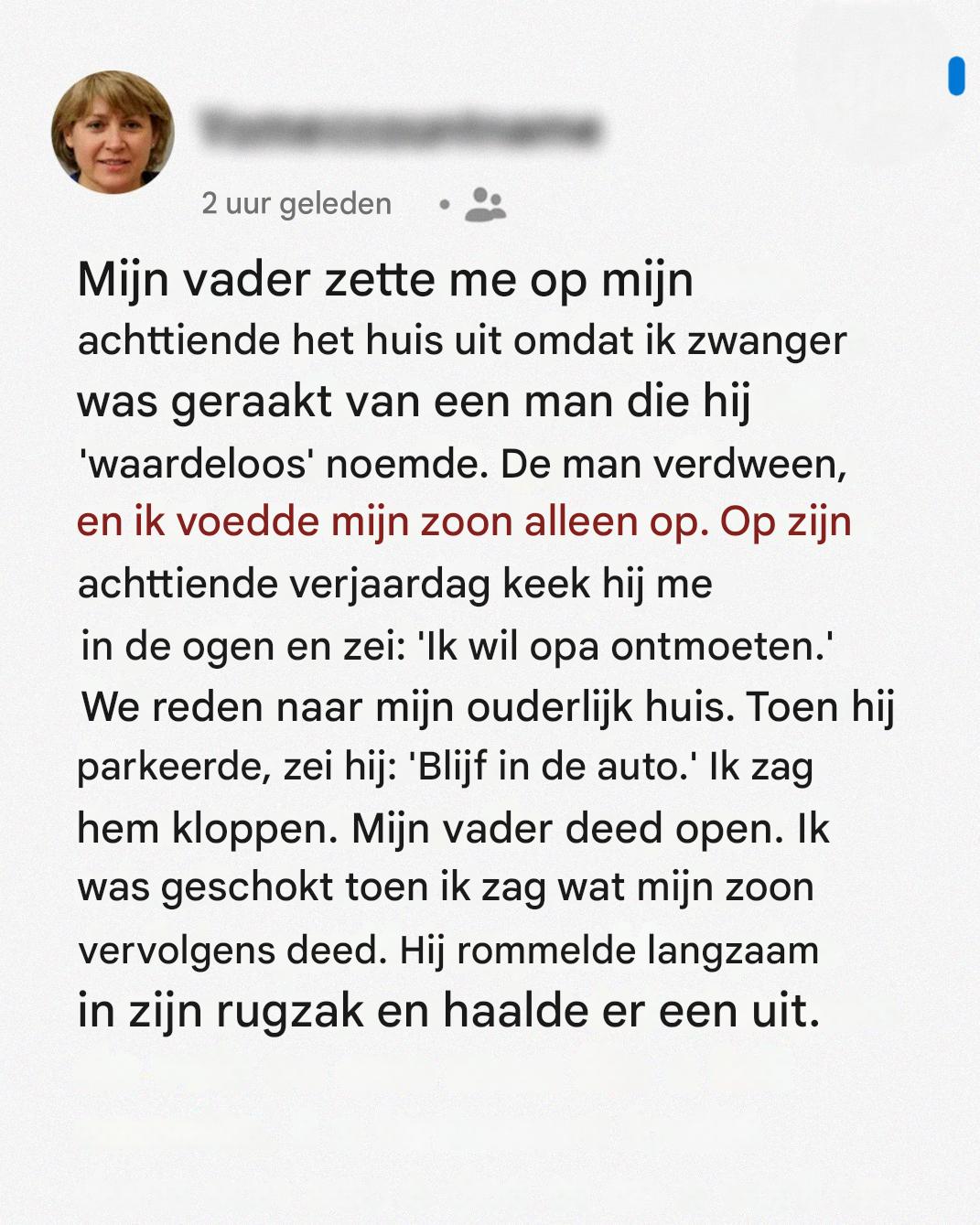 Mijn vader heeft me het huis uitgezet toen hij erachter kwam dat ik zwanger was. Achttien jaar later bezocht mijn zoon hem.