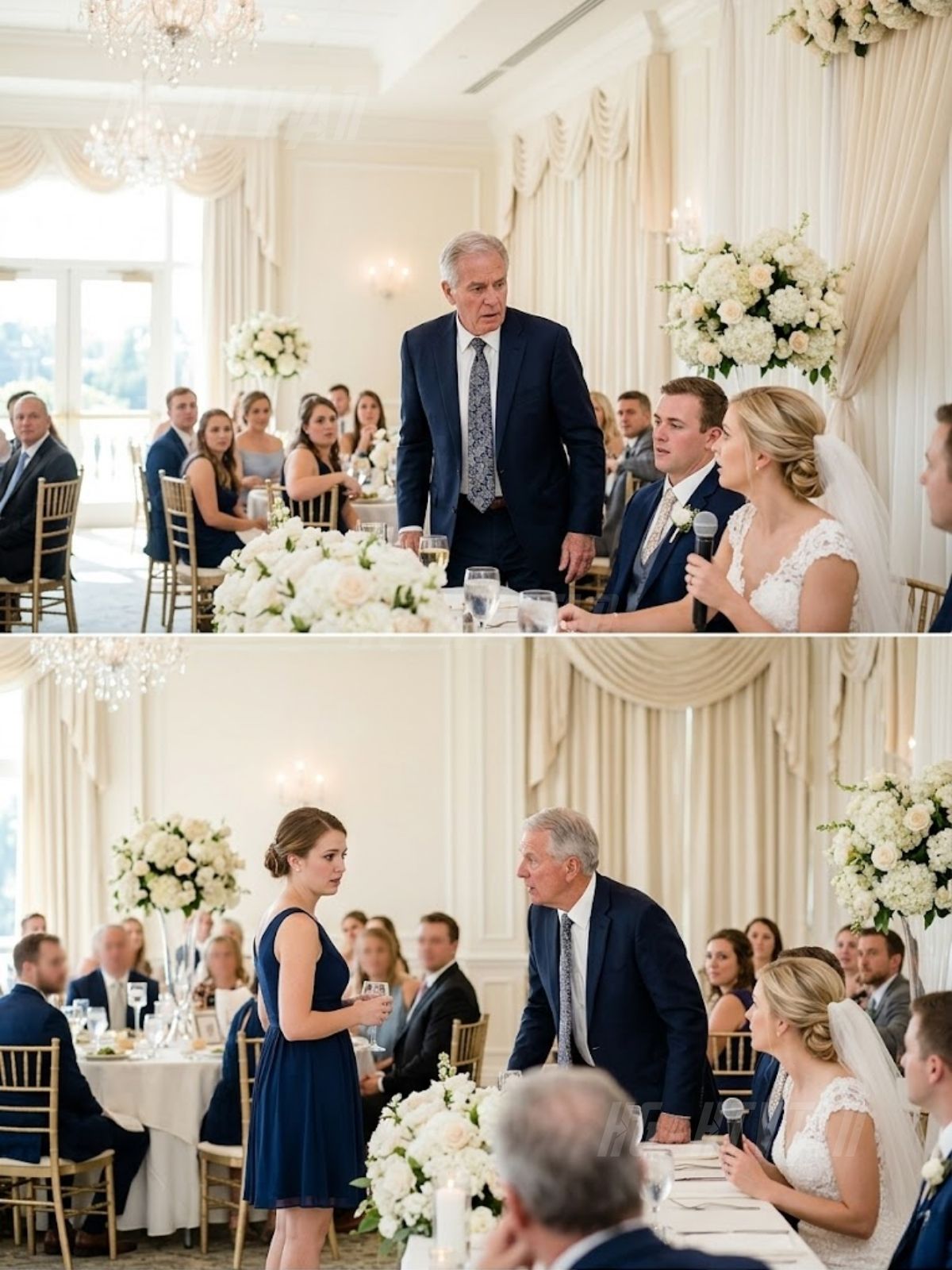 Mijn zus stond voor de 120 bruiloftsgasten, glimlachte in de microfoon en stelde me voor als « gewoon een verpleegster », alsof ik de familieschandvlek was die ze moest zien te verklaren voordat het echte feest kon beginnen. Natuurlijk lachten de mensen – omdat zij als eerste lachte, mijn vader met haar meelachte, en ik al precies zat waar ze me altijd neerzetten: ver genoeg achterin om mee te tellen, maar nooit dichtbij genoeg om er echt toe te doen. Ik zei tegen mezelf dat ik het diner moest doorstaan ​​zoals ik alles doorsta: rustig en zonder de reactie te geven die ze wilden. Maar terwijl de rest van de zaal meespeelde met haar toneelstukje, lachte de vader van de bruidegom aan de hoofdtafel geen moment – ​​hij bleef me alleen maar aanstaren, totdat hij plotseling zijn stoel naar achteren schoof, opstond en de hele balzaal muisstil werd… – Beste recepten