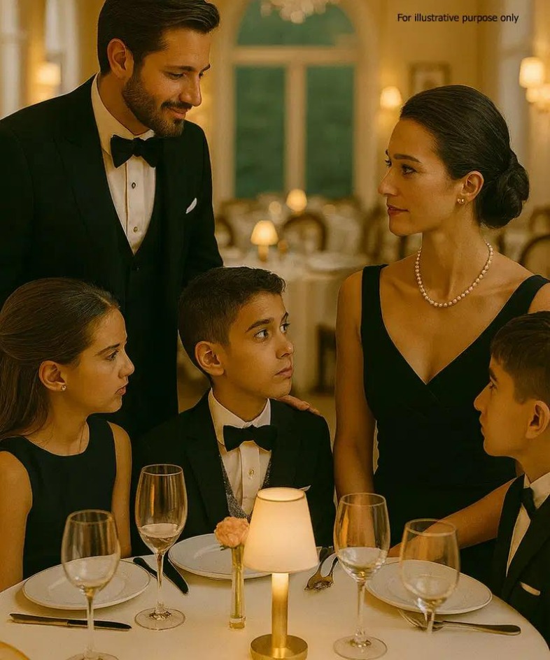 Haar krullen waren opgestoken, precies zoals ze ze op zondagochtend droeg. Ze boog zich zachtjes naar drie kinderen – een meisje en twee jongens – geen van allen ouder dan vijf. Haar uitdrukking was warm, vol tederheid.