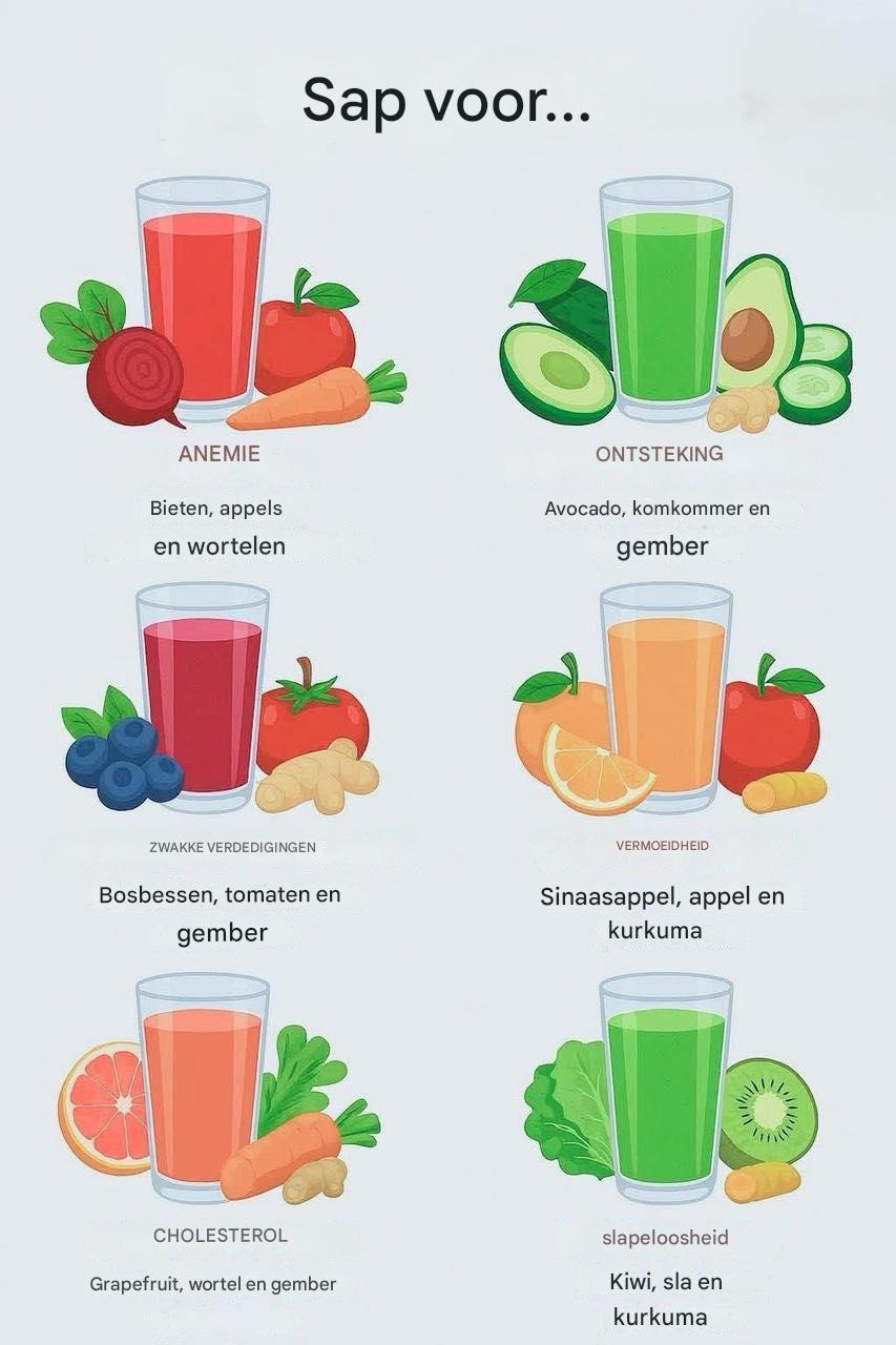 Dit sap is rijk aan ijzer, vitamine C en bètacaroteen. Biet stimuleert de aanmaak van rode bloedcellen, appel bevat antioxidanten en wortel verbetert de opname van voedingsstoffen. Ideaal voor mensen die last hebben van vermoeidheid door ijzertekort.