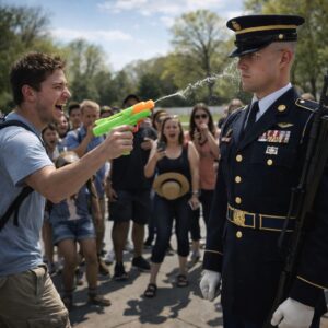 Onder de brandende aprilzon in Arlington spoot hij niet zomaar water op een grafbewaker – hij spatte het over de herinnering aan de doden. De menigte dacht dat het een stomme grap was. De bewaker wist dat dit een grens was die je niet overschrijdt. En toen het water langs zijn uniform naar beneden liep, begonnen de gevolgen zich sneller te ontvouwen dan de jongen met de camera zich kon voorstellen.