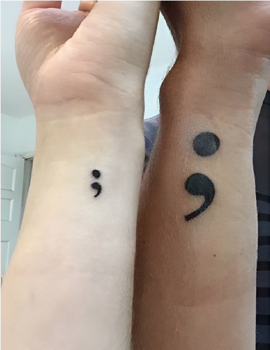 De puntkomma vertegenwoordigt het idee van doorgaan, ondanks tegenslagen. In de grammatica geeft een puntkomma een pauze aan die langer is dan een komma, maar korter dan een punt. Evenzo symboliseert het in het leven een bewuste keuze om een moeilijke situatie te overwinnen en niet op te geven.