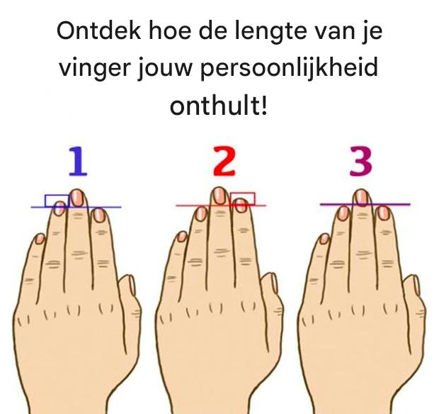 Wist je misschien niet dat de lengte van je vingers iets over je persoonlijkheid kan zeggen!? Vergelijk de lengte van je wijsvinger en ringvinger eens en kijk of die overeenkomt met je persoonlijkheidskenmerken.