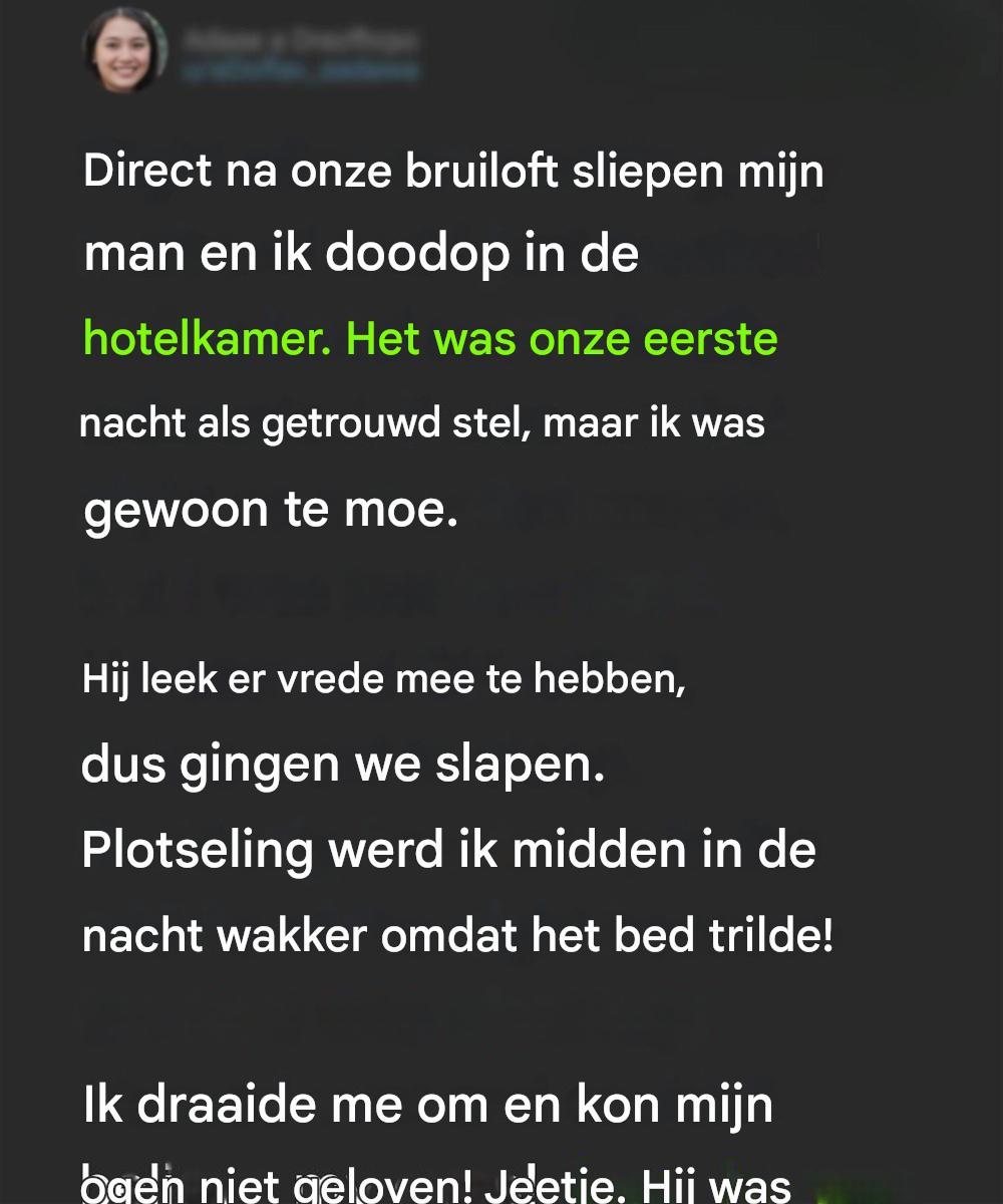 Toch werd ik midden in de nacht wakker en merkte dat ons bed schudde.