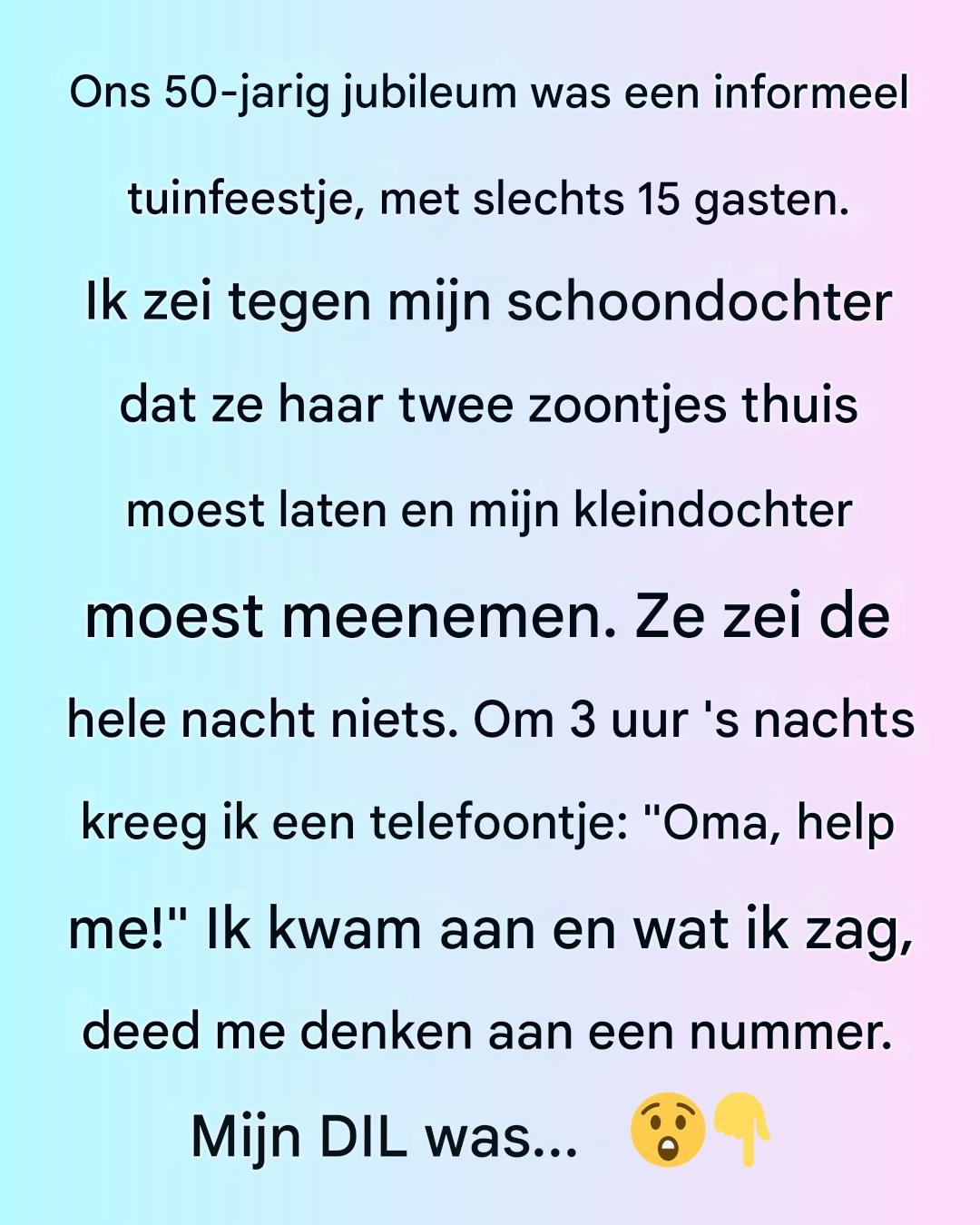 Mijn man (74F) en ik vierden onlangs onze mijlpaal. Ons 50-jarig jubileum was een informeel tuinfeestje, met slechts 15 gasten. Ik zei tegen mijn schoondochter dat ze haar twee zoontjes thuis moest laten en mijn kleindochter moest meenemen. Ze zei de hele avond niets. Alleen ter illustratie