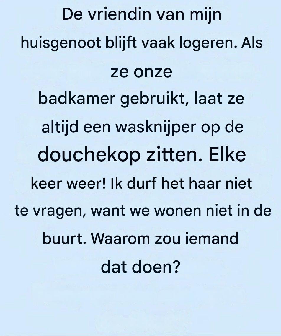 De vriendin van mijn huisgenoot blijft vaak logeren en laat altijd een wasknijper in de douche liggen. Elke keer weer! Ik ken haar niet goed genoeg om ernaar te vragen. Wat is er aan de hand?