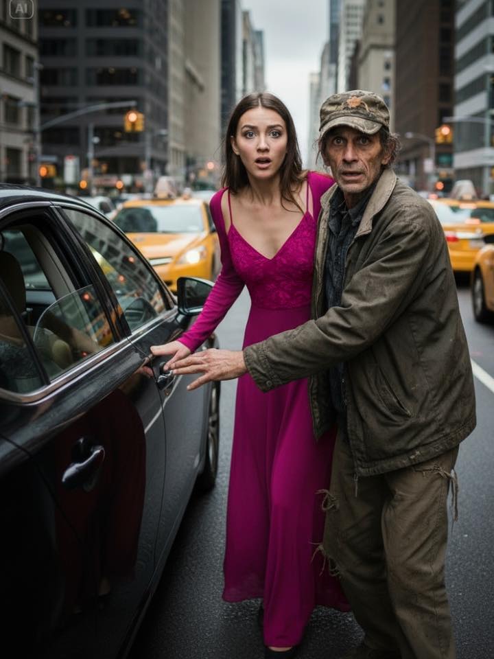 Een dakloze man rende naar me toe en riep: « Neem die auto niet! » — Ik luisterde niet. Minuten later werd iedereen die aanwezig was bij de lezing bleek toen ze zagen wie er achter me binnenkwam.