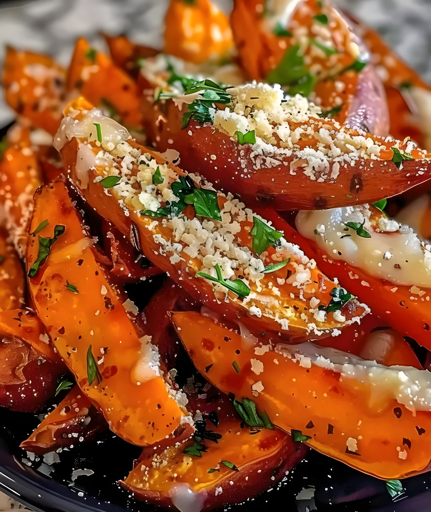 Deze knapperige, kazige en knoflookachtige zoete aardappel wedges zijn het perfecte bijgerecht of snack! π Geroosterd tot in de perfectie met Parmezaanse kaas, knoflook en verse kruiden, vormen ze een onweerstaanbare balans tussen zoete en hartige smaken. π Een gezondere variant op frietjes! π