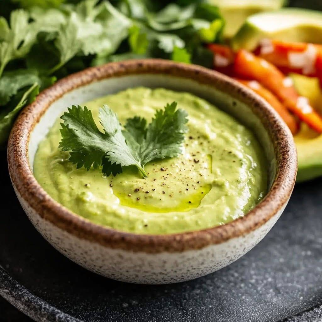 Bereiding van de ingrediënten Halveer de avocado’s, verwijder de pit en schep het vruchtvlees eruit met een lepel. Snijd de rode paprika in dunne plakjes om als garnering te gebruiken. Mix de ingrediënten Doe het vruchtvlees van de avocado, yoghurt, limoensap, geperste knoflook, olijfolie, een snufje zout en peper in een blender of keukenmachine. Mix tot een gladde en romige saus. Als de saus te dik is, kun je een beetje water toevoegen om hem naar smaak aan te passen. Garneer en serveer Doe de saus in een kleine serveerschaal. Garneer met gehakte verse koriander en dunne plakjes rode paprika voor een kleurrijk tintje. Presentatie ![]()
