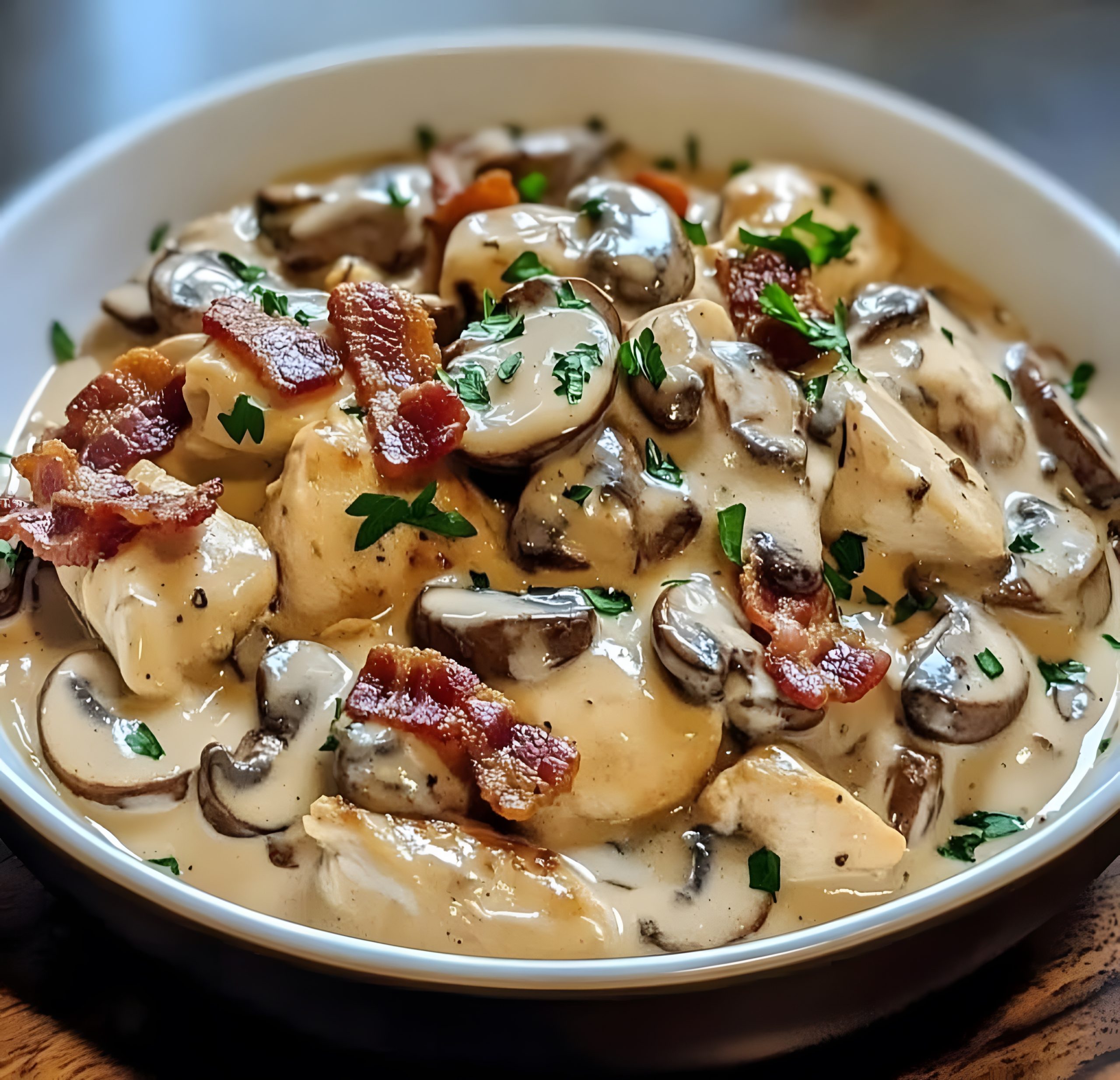 Deze Creamy Chicken Bacon Stroganoff is de ultieme comfortfood! Een romige saus, knapperige bacon, sappige kip en heerlijke champignons zorgen samen voor een smaakvolle, luxe maaltijd. Perfect voor een doordeweekse avond of een speciaal diner. 😍