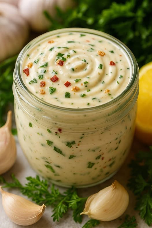 De romige witte knoflooksaus is een waar culinair juweeltje, bekend om zijn eenvoud en intense, maar evenwichtige smaak.