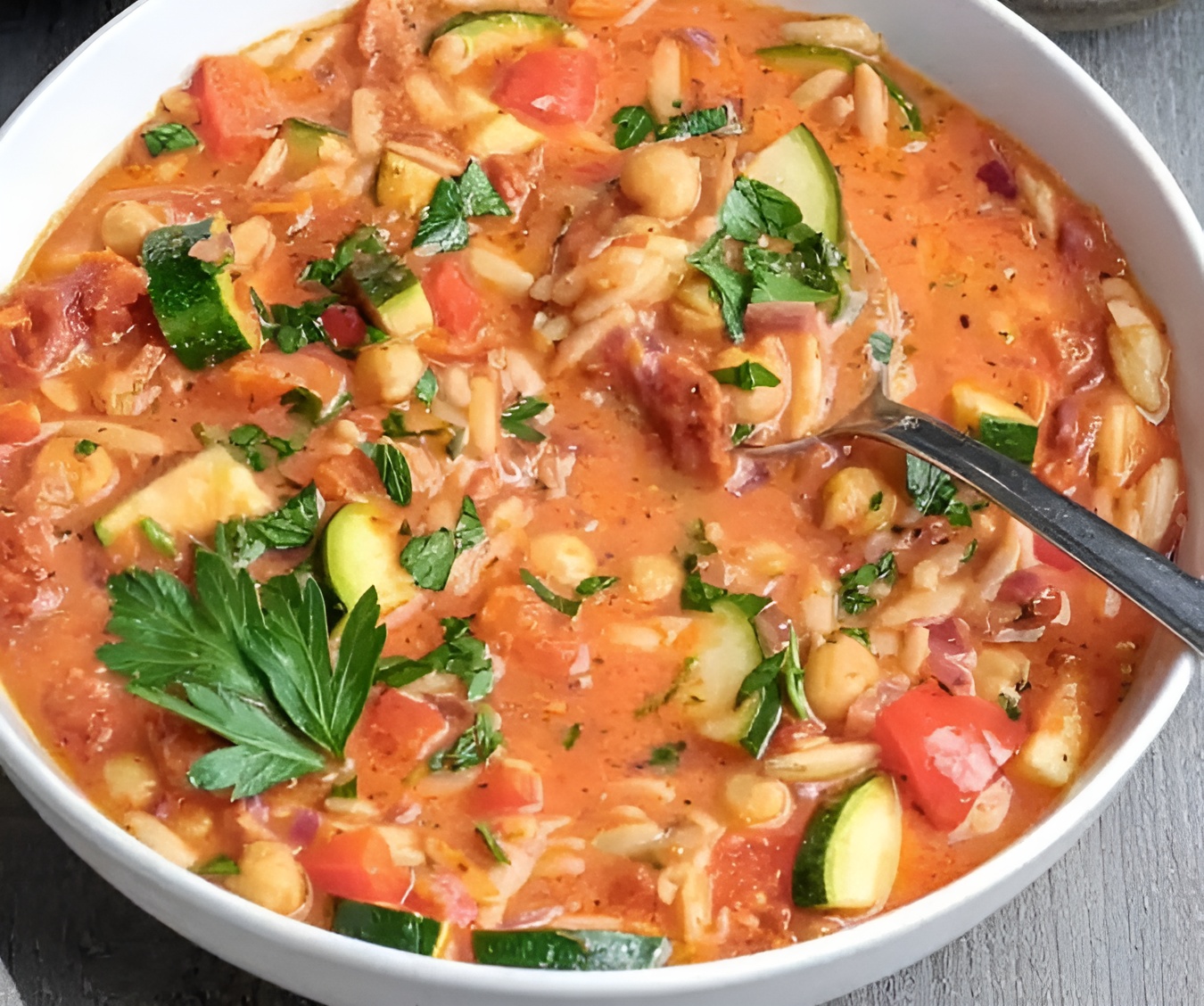 Deze romige Mediterrane soep zit boordevol smaken en is perfect voor een lichte, gezonde maaltijd. Met verse groenten, eiwitrijke kikkererwten en zachte orzo-pasta is het zowel voedzaam als heerlijk.
