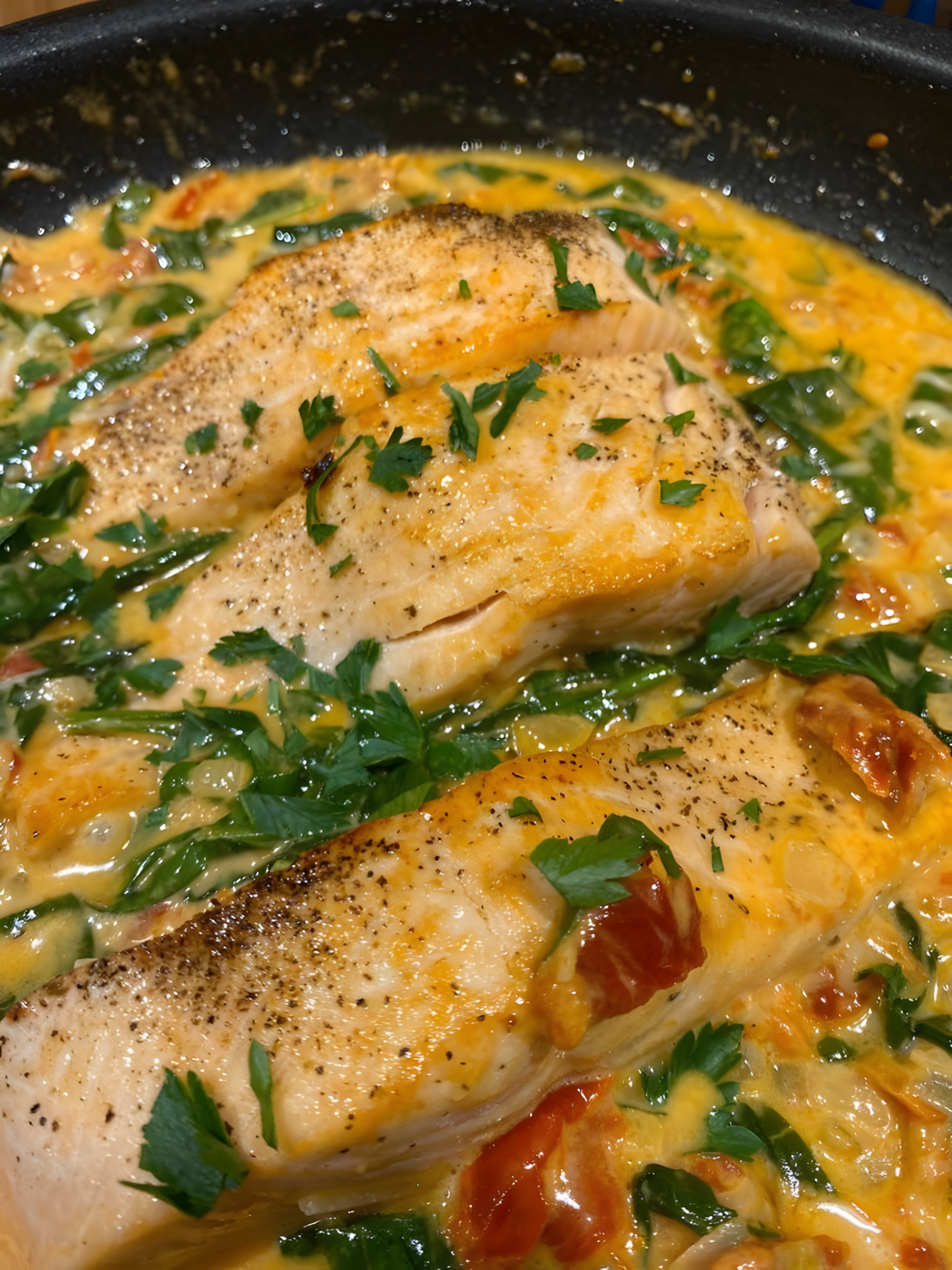 Dit Romige Toscaanse Zalm recept is een gerecht van restaurantkwaliteit dat verrassend eenvoudig thuis te maken is. Schilferige zalmfilets worden tot in de perfectie aangebraden en vervolgens gesudderd in een decadente roomsaus met knoflook, spinazie en de heldere uitbarsting van zongedroogde tomaten. Serveer over pasta, rijst of naast geroosterde groenten voor een complete en onvergetelijke maaltijd.