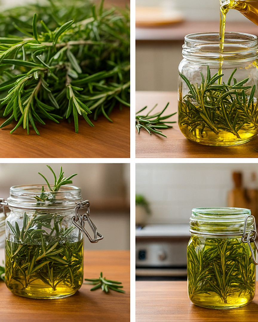 Trektijd: Door de rozemarijn een nacht in de olie te laten trekken, kunnen de heilzame stoffen uit de plant langzaam en op natuurlijke wijze worden onttrokken.