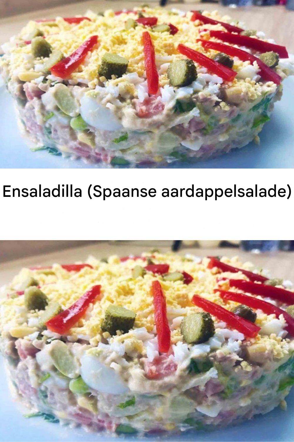 Kook de aardappelen met schil in 1 grote hoeveelheid gezouten water, kook de eieren hard. Doe de tonijn, de erwten, de olijven (houd er een paar achter voor de garnering), de paprikablokjes (houd 4 lange repen achter voor de garnering) en de in plakjes gesneden eieren (houd er een paar achter voor de garnering) in een slakom en meng de « groenten » goed.