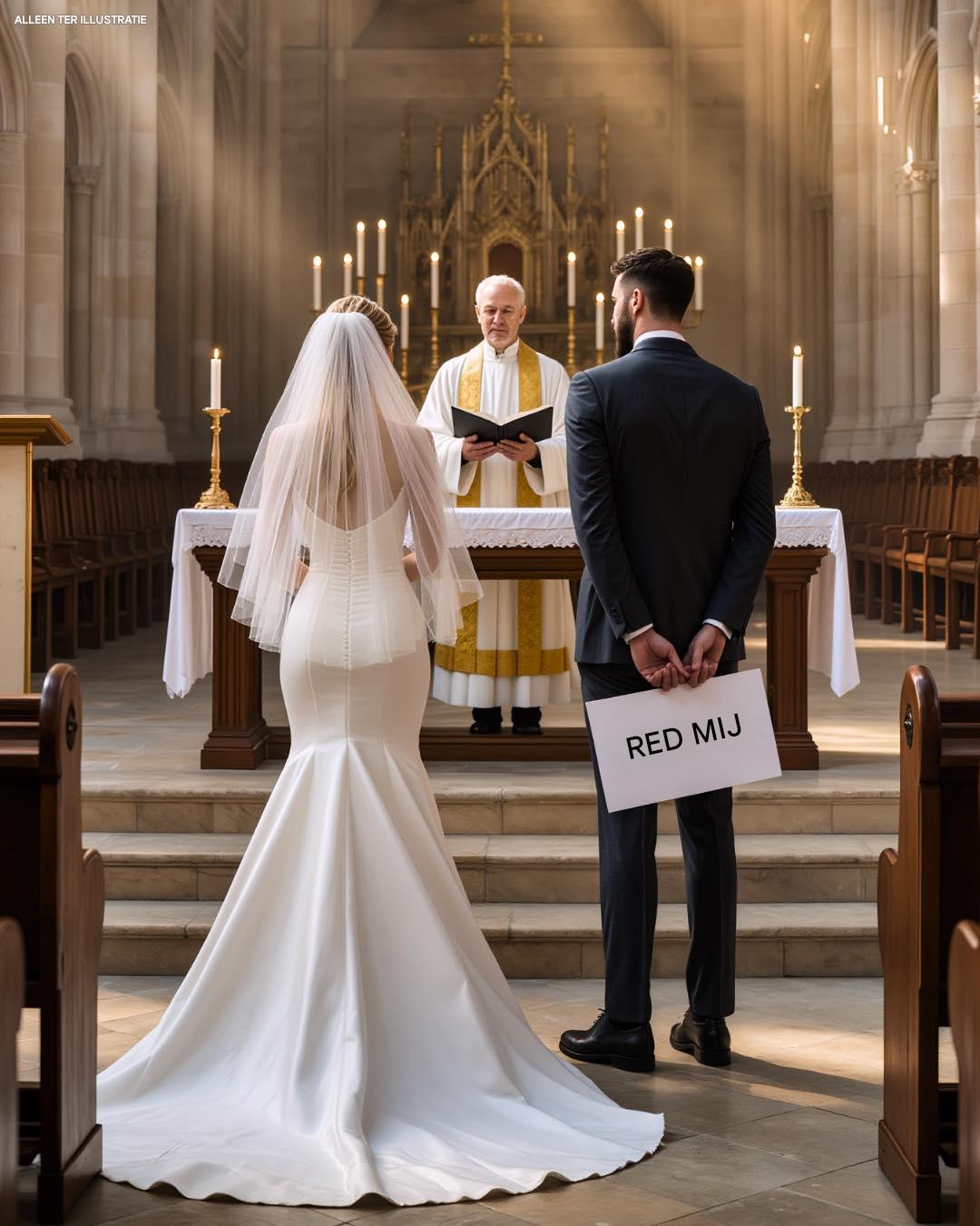 Tijdens de kerkelijke bruiloft hield mijn verloofde gekscherend een bord achter zijn rug met de tekst ‘Red mij’: Ik was diep gekwetst en heb hem een ​​lesje geleerd