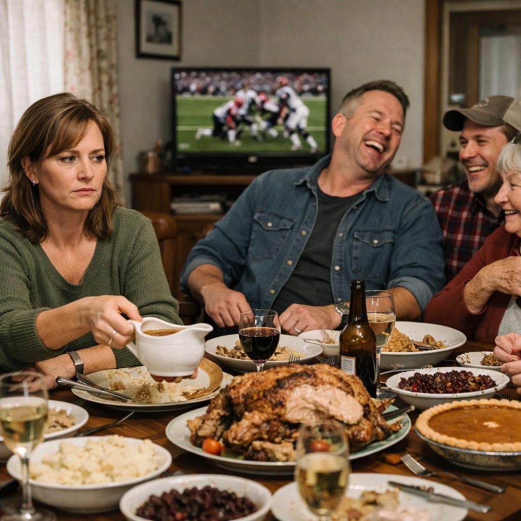 In onze kleine eetkamer net buiten Wichita, Kansas, terwijl er vanuit de woonkamer een NFL-wedstrijd te horen was en de geur van kalkoen en pompoentaart door het huis zweefde, bleef ik de borden doorgeven en de glazen bijvullen alsof er niets aan de hand was, terwijl er in mij eindelijk iets volkomen tot rust kwam.