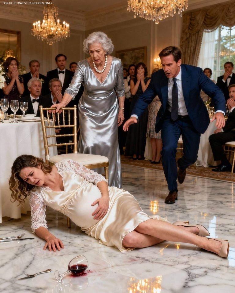 Aan het roer stond Beatrice Harrington, statig, met een scherpe blik en een indrukwekkende kalmte, een vrouw die de reputatie van haar familie baseerde op controle, uiterlijk vertoon en gefluisterde macht. Tegenover haar stond Elena, Christophers vrouw, acht jaar zwanger, die een stille gratie uitstraalde. Ze droeg een lichtblauwe jurk die haar ronde buik accentueerde, en haar glimlach was vriendelijk maar voorzichtig.