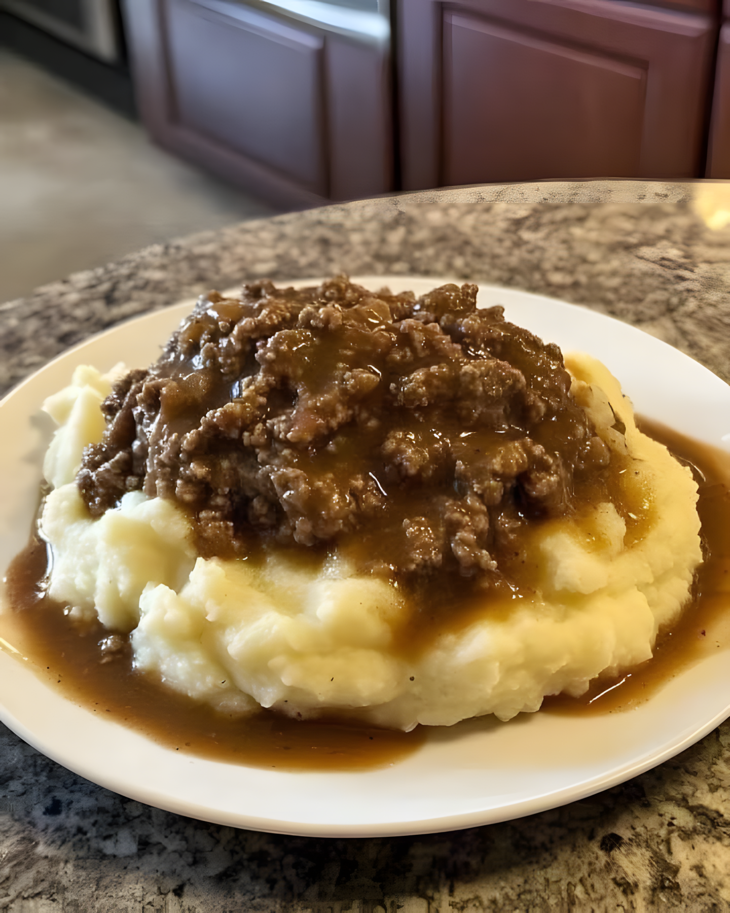 Dit stevige en smaakvolle gerecht is de ultieme troostmaaltijd! 🀀 Sappig rundergehakt dat zachtjes pruttelt in een rijke, hartige jus, geserveerd bovenop een bedje van romige, boterachtige aardappelpuree – deze maaltijd is eenvoudig te bereiden en zit boordevol smaak! Perfect voor een snelle doordeweekse maaltijd of wanneer je gewoon snakt naar iets warms en bevredigends. 🍽️✨
