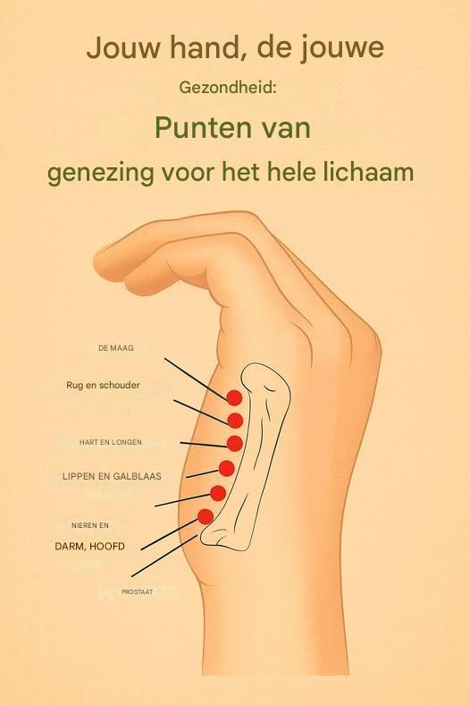 Wist u dat uw hand de kaart van uw hele lichaam is? In reflexologie en verschillende traditionele geneeswijzen wordt aangenomen dat bepaalde punten op de hand verbonden zijn met interne organen en lichaamssystemen. Door op deze helende punten te drukken of ze te masseren, kunt u uw welzijn bevorderen, stress verminderen en zelfs bepaalde kwalen verlichten.