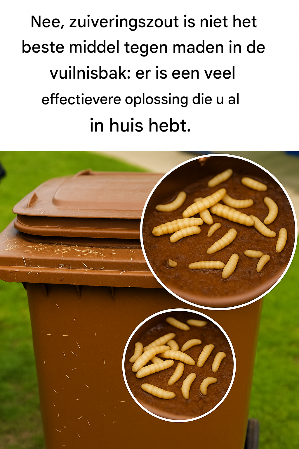 Zuiveringszout heeft een milde geurverdrijvende en drogende werking. Het kan geurtjes verminderen en in sommige gevallen de madenactiviteit vertragen. Maar op zichzelf doodt het maden niet snel of volledig . Je kunt het in je vuilnisbak strooien en hopen dat het werkt, maar de kans is groot dat je daarmee het onvermijdelijke uitstelt: een kruipende, stinkende bende.
