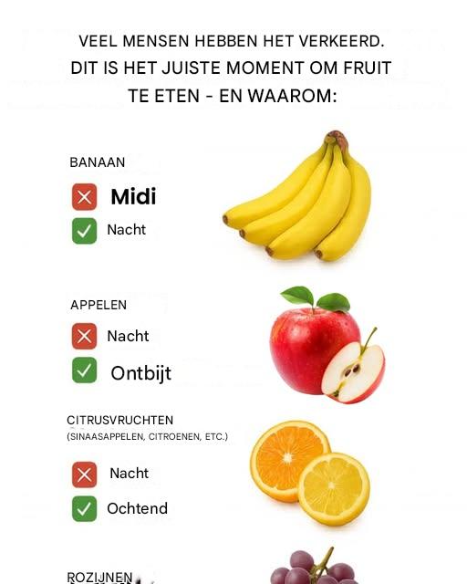 We horen vaak dit advies: « Eet 5 stuks fruit en groente per dag! » Ja, maar op welk tijdstip van de dag? Want hoewel fruit uitstekend is voor je gezondheid, varieert het effect ervan op je spijsvertering, energie en slaap afhankelijk van het tijdstip van de dag. Daardoor kan een gezonde vrucht die op het verkeerde moment wordt gegeten, soms je lichaam verstoren. Hier zijn de ideale momenten om 15 veelvoorkomende soorten fruit te eten… en waarom het verschil kan maken.