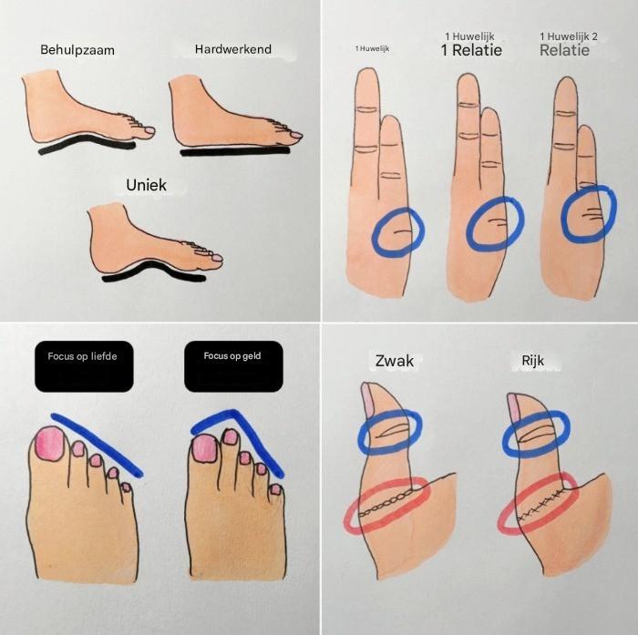 Laten we eens nader bekijken wat deze afbeelding zegt over de verschillende vormen en lijnen op de voeten, vingers en duimen, en wat ze betekenen.