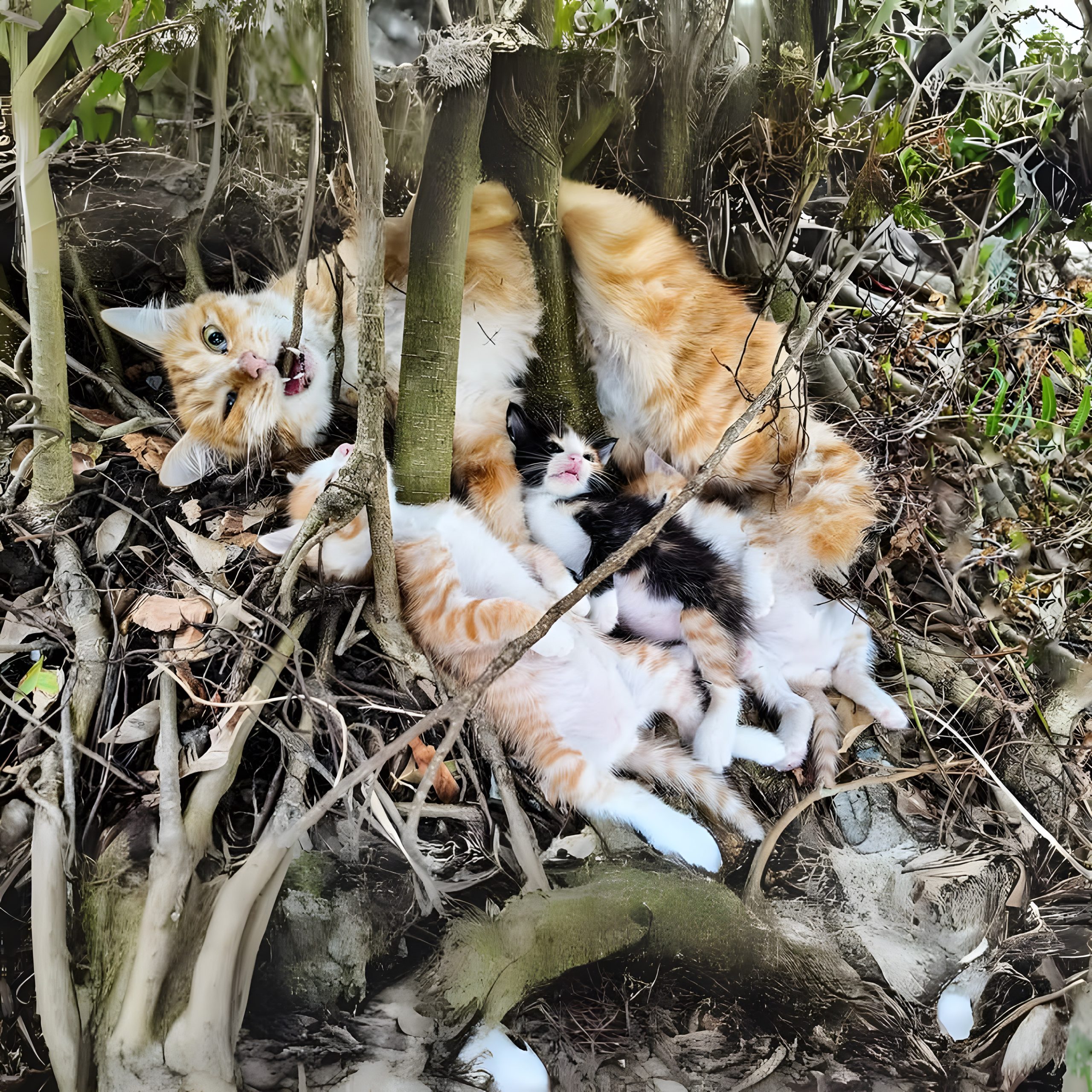 Bij aankomst troffen we de moederpoes opgerold aan onder de kronkelige wortels van de boom, haar ogen wijd open van angst terwijl ze haar nest kittens beschermde. De wortels vormden een natuurlijke maar gevaarlijke omheining, waardoor het voor de kattenfamilie moeilijk was om te ontsnappen. De moederpoes had duidelijk geprobeerd haar kittens te beschermen, maar haar dunne lichaam en klittende vacht lieten de tol van honger en uitputting zien. De kittens, amper een paar weken oud, klampten zich vast aan hun moeder, zwak en hulpeloos.