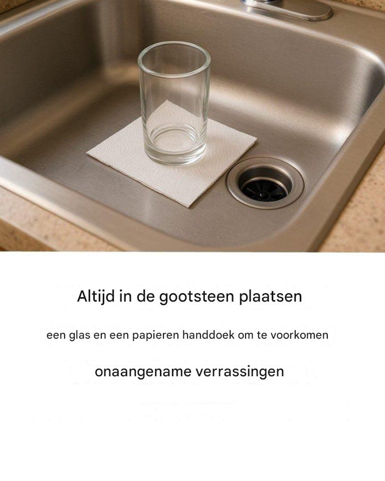 een glas of bord ondersteboven op een vochtig stuk keukenpapier in de gootsteen zetten, vertraagt de verdamping en creëert een vochtige micro-omgeving. Dit helpt het water in de gootsteenafvoer schoon te houden en vermindert de kans op onaangename geurtjes.